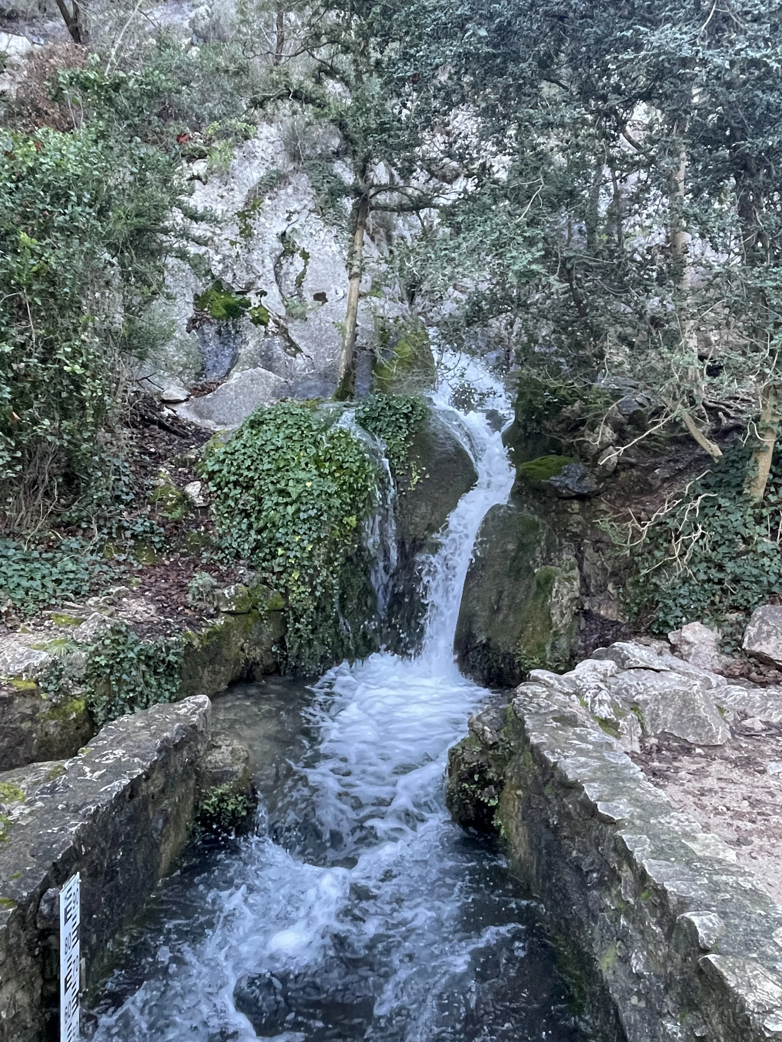 Le vrai plus de ce parc : la présence omniprésente et chantante de l’eau, à travers le cours d’eau cristallin et frais du Fauge, des cascades, des petits torrents, sans oublier la source du Fauge, située à une cinquantaine de mètres derrière l’abbaye, et qui ne tarit jamais. Et signe que l’eau du Fuge est particulièrement pure, vous pourrez apercevoir des algues rouges habituellement présentes dans les torrents alpins, Hildenbrandia rivularis. Ici, l’eau coule de la montagne (1 000 m) et s’infiltre par la roche karstique, agissant comme un filtre particulièrement efficace. Pour ceux qui aiment les histoires, une légende raconte une autre origine à ces algues : “par une nuit d’orage, un groupe de chevaliers revenus de croisades et surpris par la pluie, firent halte au monastère de Saint-Pons. L’un des chevaliers reconnut celle qui lui avait été promise quelques années plus tôt, Blanche de Simiane. Sans coup férir, il voulût récupérer celle qu’il crut sa dulcinée. Mais la très pieuse Blanche, mariée à Dieu, s’enfuit et sauta du pont pour échapper à son funeste destin. Depuis des siècles, son sang vermeil encore visible tapisse le fond du ruisseau” (source : Département 13).