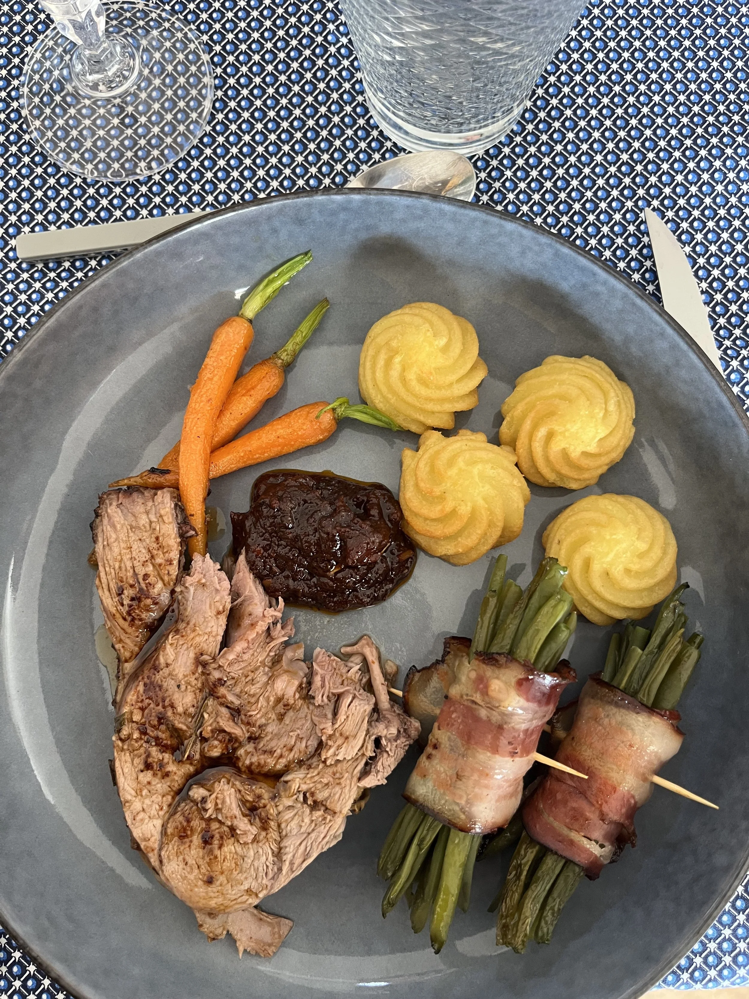 Servir avec des fagots de haricots verts, des pommes dauphine ou encore des flageolets.